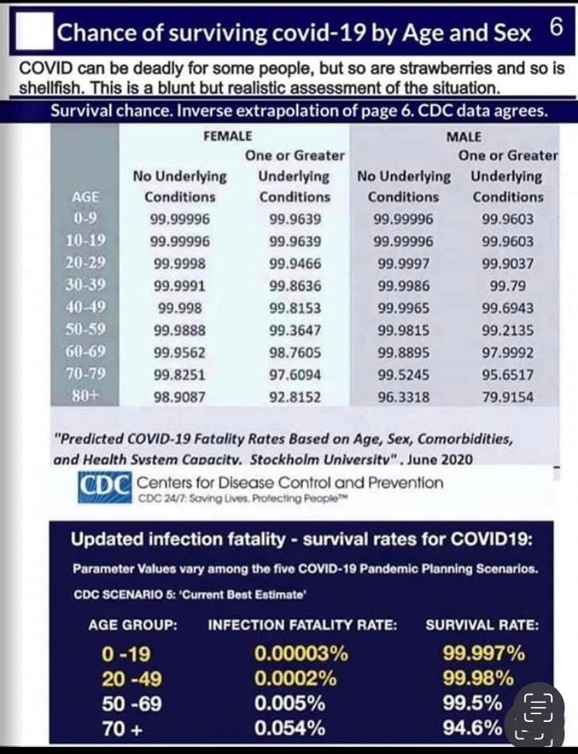These numbers were the only statistics one needed to confirm that the one-size-fits-all Covid reaction was a scam. These figures comported with what I and every one of the many people I asked were directly observing: no remotely healthy person under 90 was dying from The Virus. Only a tiny fraction were dying with it.