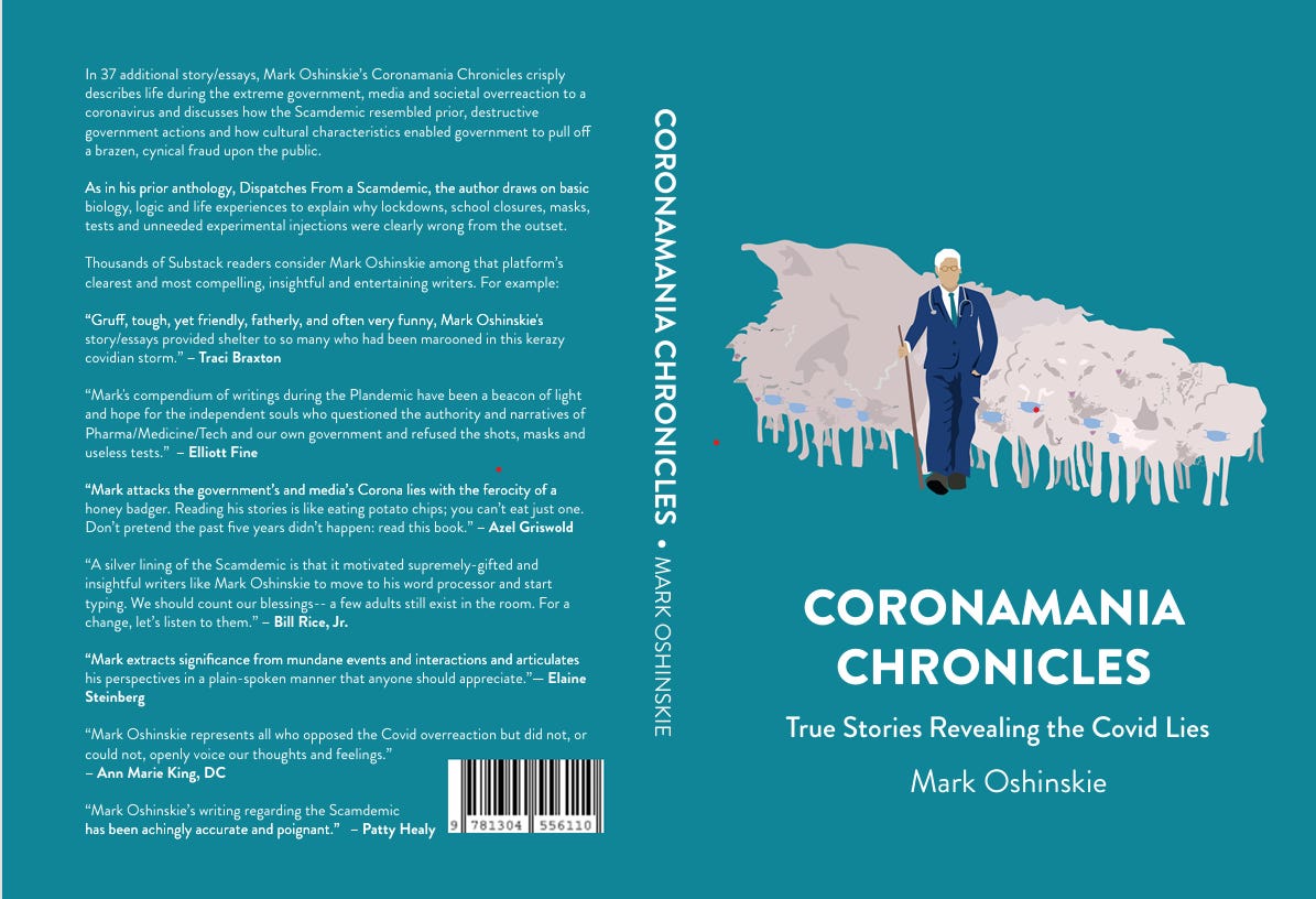 Over the past few months, I’ve compiled a 221-page anthology of 37 additional story/essays spanning the past five years. I just put these in print. I’m calling this anthology Coronamania Chronicles: True Stories that Revealed the Covid Lies. While Dispatches developed the theme that everyone should have seen the Scam from the beginning, Chronicles focuses more on how life was during this massive, brazen fraud, how cultural characteristics caused people to fall for the lies and how the Scamdemic resembled prior, destructive government interventions.